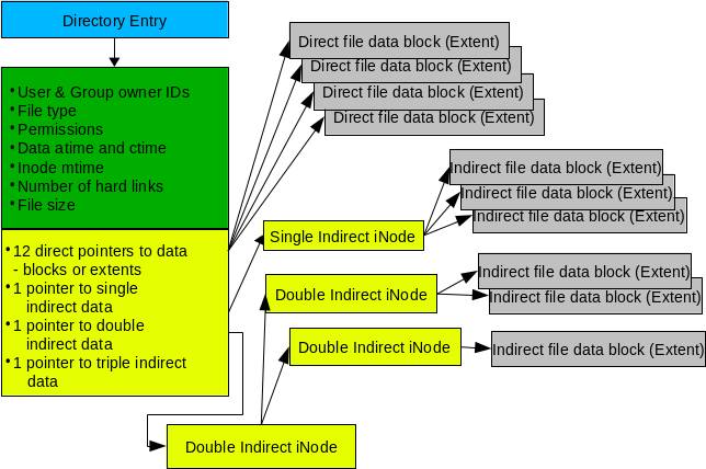 间接节点是文件系统中的正常数据块,它仅用于描述数据而不用于存储元数据,因此可以支持超过 15 个条目。例如,4K 的块大小可以支持 512 个 4 字节的间接节点,允许单个文件有 12(直接)+ 512(间接)= 524 个扩展盘区。还支持双重和三重间接节点,但我们大多数人不太可能遇到需要那么多扩展盘区的文件。