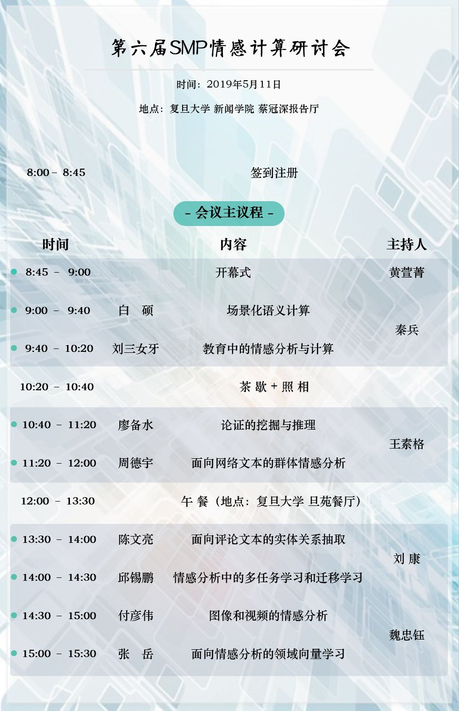 在中国中文信息学会社会媒体处理专委会情感分析工作组的指导下,由复旦大学大数据学院、计算机学院共同承办的“第六届SMP情感计算研讨会”将于2019年5月11日(周六)在复旦大学召开。