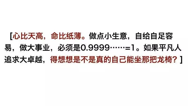 平凡人追求大卓越,得思考自己是否是否真的能坐那把龙椅。马云说平凡人做非平凡事,但事实上马云能在99年的时候,能超前预见到中国互联网未来很多机遇,能在一穷二白的那么艰难情况下,能说服17人竭尽所有跟着他一起创业,在那个时代已经远远超出平凡人的能力了。