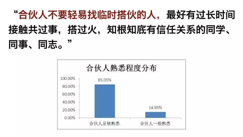 我们是创始团队最好找过去搭过伙,知根知底,有信任关系的同学、同事或者同志。我们研究的中国数百家估值过十亿以上的公司样本数据中,合伙人之间足够熟悉的比例高达85%,这个数据已经证明了不少问题。