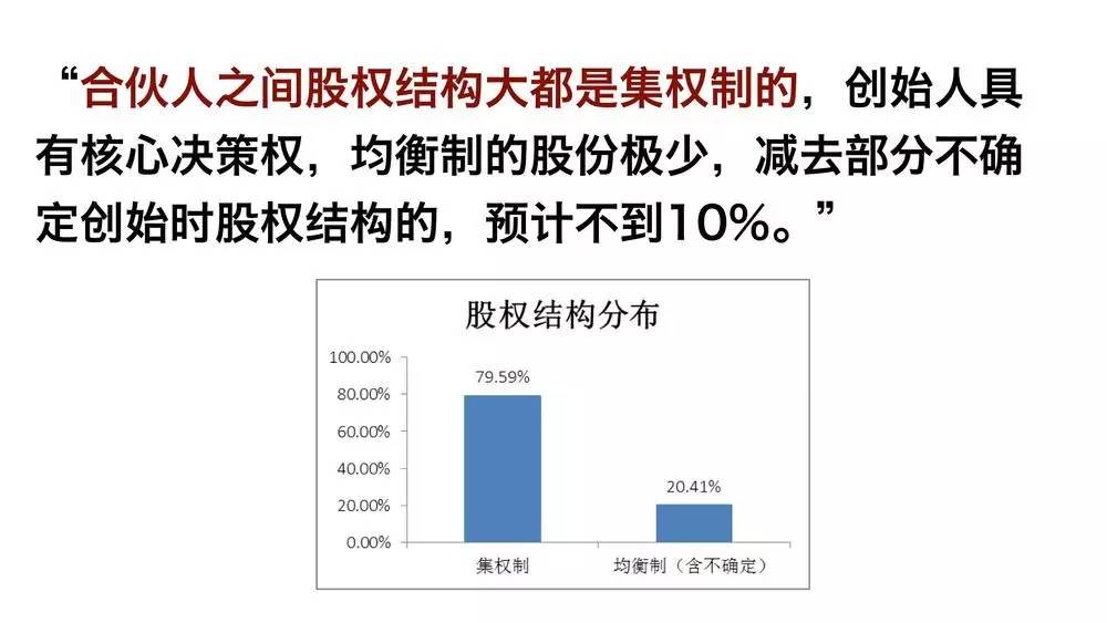 按照过去我们研究的千里马公司各种样本数据中,我们发现90%的公司都选择了集权制,集权制能保证创始人具有核心决策权,而股权越平均、越分散的团队分崩离析的概率越大。