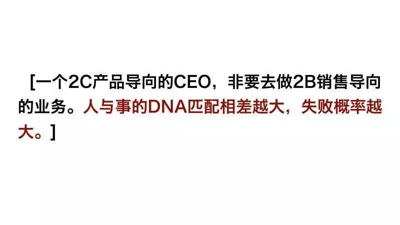 人与事的DNA匹配相差越大,创业失败就概率越高。换句话说,一个2C产品导向的CEO,非要让公司去尝试做2B销售导向的业务,如果还没有相应互补的合伙人辅助,那么是非常难的。