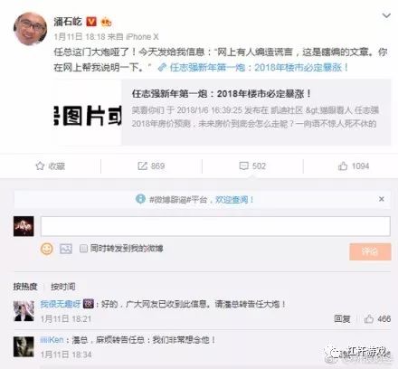 明确否定调控的价值,这还得了!任总坐不住了,让网络红人潘石屹发文澄清,于是有了潘石屹的这条微博:“任总这门大炮哑了!今天发给我信息:网上有人编造谎言,这是瞎编的文章。你在网上帮我说明一下。”