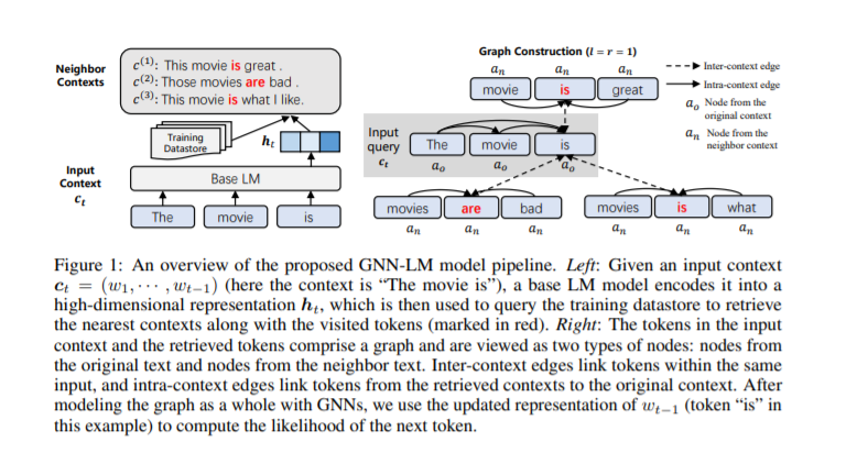 本文提出了GNN-LM,将图神经网络与语言模型相结合,通过允许在整个训练语料库中引用相似的上下文,扩展了传统的语言模型。使用k近邻检索与输入的表示最相似的邻居,我们为每个输入构建了一个有向异构图,其中节点是来自输入上下文或检索到的邻居上下文的token,边表示token之间的连接。然后利用图神经网络从检索到的上下文中聚合信息,以解码下一个token。实验结果表明,GNN-LM在标准数据集中优于强基线,并且通过与kNN-LM结合,能够在WikiText-103上取得最优效果。