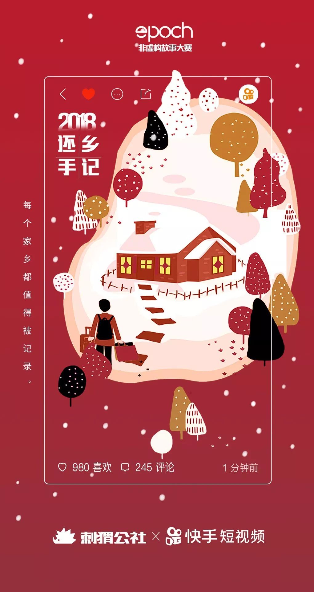 刺猬公社与快手联合主办的第二届Epoch非虚构故事大赛之春节“还乡手记”主题活动正式启动,我们希望通过这个比赛,提醒你,触动你,让你拿起笔或举起手机,记录下还乡的旅途,以及你跟家乡彼此改变的痕迹。