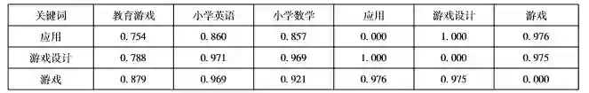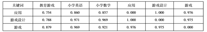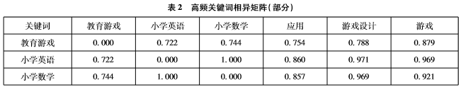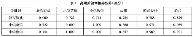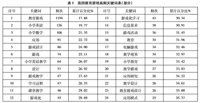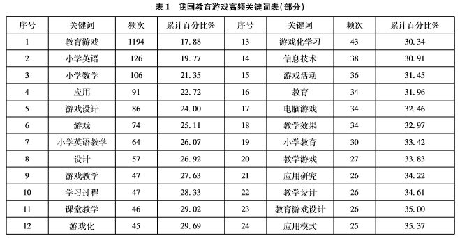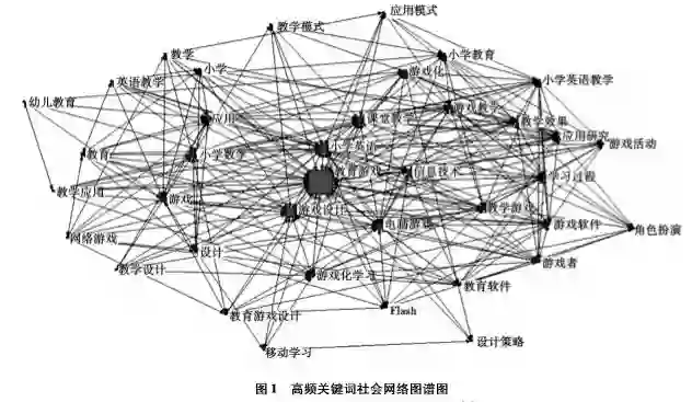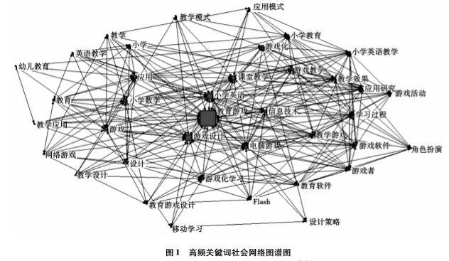 从表1中可以看出,排在前10位的高频关键词分别是教育游戏(1194次)、小学英语(126次)、小学数学(106次)、应用(91次)、游戏设计(86次)、游戏(74次)、小学英语教学(64次)、设计(57次)、游戏教学(47次)及学习过程(47次),排在前10位的关键词反映了教育游戏的应用领域、设计研究及基本概念等。