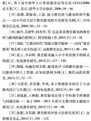 目前国内对教育游戏这一概念并没有统一的认识,不同的研究者对教育游戏的定位并不相同,有的研究者将其定位为“计算机游戏类软件”“计算机游戏”,有的研究者将其定位为“教育软件”,虽然定位不同,但都强调了教育游戏的两个基本属性———教育性及游戏性。保持教育性与游戏性之间的平衡是教育游戏设计与开发的关键,因此自教育游戏研究兴起以来,该内容就一直是研究者关注的重点。不少研究者专门对此展开深入讨论,尽管这些讨论给人们提供了一些有助于保持教育性与游戏性平衡的可行性策略,但这些策略是否具有可靠性,还需要通过大量的实证研究进行验证,因此研究者在继续关注教育性与游戏性平衡性策略研究的同时,要积极开展实证研究,通过定量及定性的分析方法验证策略的可靠性并对其进行完善。此外,从文献调研中发现,“教育游戏”还存在着诸多相关概念,如“教学游戏”“严肃游戏”“娱教技术”“数字化游戏学习”“游戏化教学”“轻游戏”“游戏化”“电子游戏”等,众多的概念容易造成混用乱用的现象,因此,研究者需要进一步加强教育游戏的基础理论研究,厘清这些概念的涵义、产生的背景及关系,从而避免教育游戏相关概念的乱用,促进教育游戏健康快速地发展。