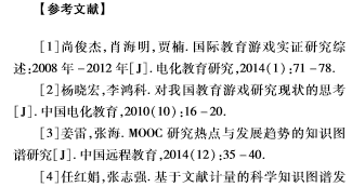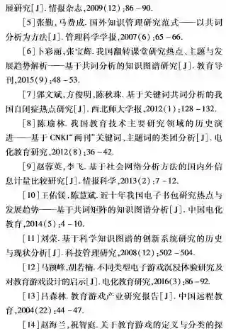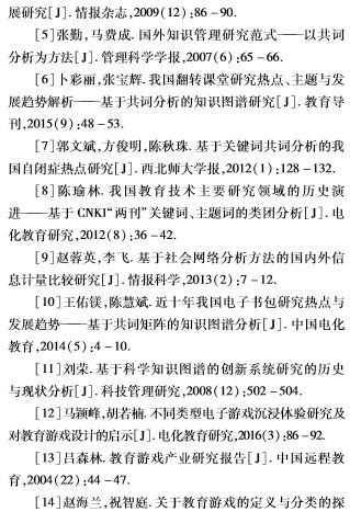 教育游戏是教育和游戏相整合的产物,其作为未来游戏与教育的发展趋势之一,受到了越来越多研究者的关注。关于教育游戏的研究现状,尚俊杰等[1]选取10份具有较强国际影响力并持续关注教育游戏研究的英文期刊为研究样本,对2008年至2012年的国际教育游戏进行了实证研究;杨晓宏等[2]采用文献研究法,对93篇有关教育游戏的论文进行了归纳和整理,并在此基础上分析了我国教育游戏研究的现状。以上研究虽系统地论述了国外和国内教育游戏的研究现状,但面对不断发展变化的教育游戏,研究者依旧有必要对国内教育游戏领域研究的热点及主题进行阶段性及深层次的了解与分析。基于此,通过采用科学知识图谱的方法,利用客观的数据,全方位多角度地解析国内教育游戏的研究现状,并分析其发展趋势,以指导教育游戏的后续相关研究。