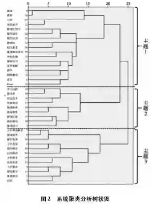 社会网络分析可以揭示出高频关键词的地位及其之间的关系,为了进一步了解教育游戏的研究主题,文章进行了聚类分析。聚类分析以这些关键词两两在同一篇文章中出现的频率为分析对象,利用聚类的统计学方法,把关联密切的关键词聚集在一起形成类团[7]。其具体过程是将相异矩阵导入到SPSS20.0中,通过系统聚类获得高频关键词的聚类树状图,如图2所示,相异矩阵如表2所示。需要说明的是,相异矩阵中两个关键词之间的数据越接近0,表明这两个关键词之间的距离越小,相似度越大[10]。