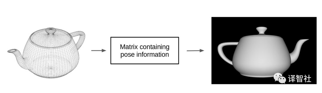 为了把一个网格物体变成像素在屏幕上显示出来,电脑会取这整个物体的姿态,然后与一个变换矩阵相乘。这样就会在一个较低的维度(2D)输出物体部分的姿态,这就是我们在屏幕上所看到的画面了。