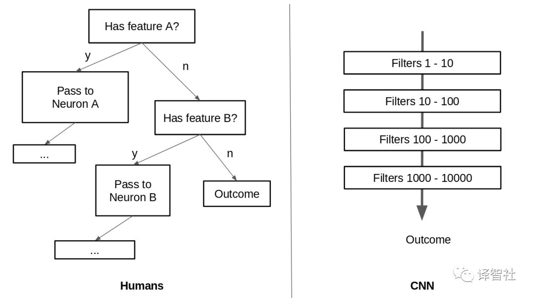 根据 Hinton 所说的,当视觉刺激被触发的时候,大脑里面有一种内在的机制,将低层次的视觉数据「导航」到它认为可以最好地处理这些数据的部分。而卷及网络使用多层滤波器来从底层可视数据中提取高级信息,所以这种导航机制就不存在了。
