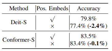 当去除Positional Embedding时,DeiT-S的精度降低了2.4%,而Conformer-S的精度略有下降。