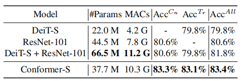 如上图所示,CNN支路、Transformer支路、Conformer-S的精度分别达到83.3%、83.1%和83.4%。而CNN和Transformer集成模型的精度也只有81.8%。