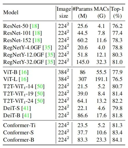 如上表所示,在类似的参数量和计算量下,Conformer的性能均优于CNN和Vision Transformer。