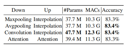 上表展示了不同的上/下采样策略,包括max-pooling、mean-pooling、卷积和基于注意力采样的结果。