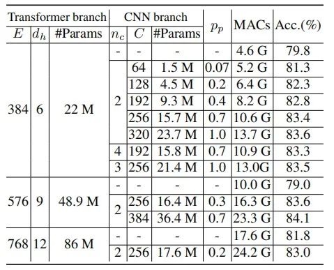 上表展示了不同参数量下的性能。可以看出,通过增加CNN或Vision Transformer分支的参数量,可以提高精度。
