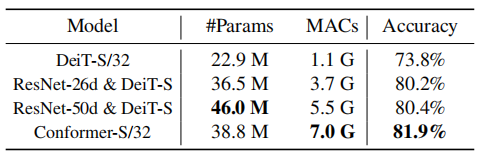 可以看出,具有相当的计算量下,Conformer-S/32优于串行的结构。