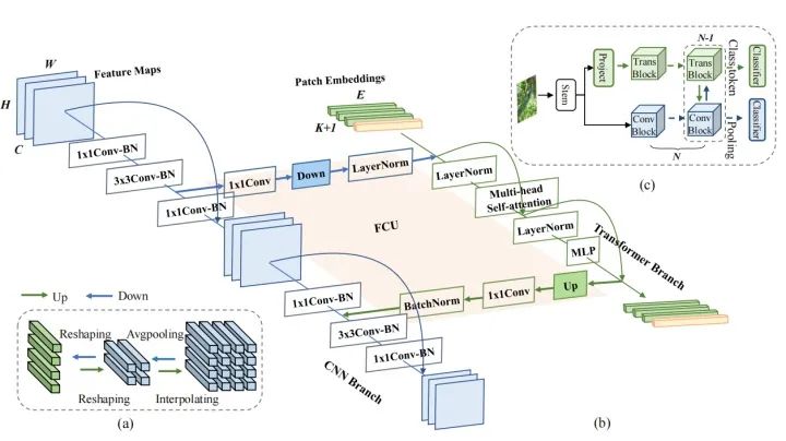 一方面,作者认识到CNN和Transformer的特征维度是不一致的。CNN特征的维度是C×H×W(C、H、W分别为通道、高度和宽度),但是Transformer的patch embedding维度是(K + 1) × E(K、1和E分别表示图像patch的数量、[cls] token的数量和embedding维度)。当输入给Transformer分支时,首先需要通过1×1卷积来对齐通道维度,然后进行下采样(如上图(a)所示)。当从Transformer分支送入到CNN分支时,也是需要通过1×1卷积来对齐通道维度,进行上采样(如上图(a)所示)。此外LayerNorm和BatchNorm用于归一化特征。