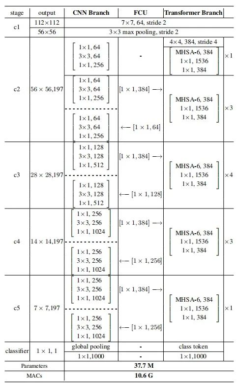 如上图(b)所示,CNN分支采用特征金字塔结构,其中特征图的分辨率随着网络深度的增加而降低,而通道数随着网络深度的增加而增加。作者将整个CNN分支分为4个阶段(如上表所示)。每个阶段由多个卷积块组成,每个卷积块包含 个bottleneck。在实验中, 在第一个卷积块中被设置为1,并在随后的N−1卷积块中设置为 。