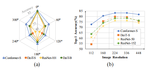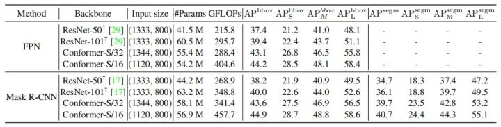 作者通过实验证明,在相似的参数和复杂度下,Conformer在ImageNet上比DeiT-B好2.3%。在MS-COCO数据集上,它在目标检测和实例分割任务上,分别比ResNet-101高出3.7%和3.6%的mAP。