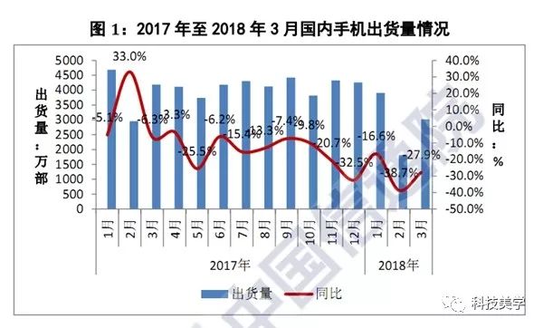 根据中国信息通信研究院发布的《2018年3月国内手机市场运行分析报告》,2018年3月份中国智能手机出货量2808.3万部,同比大跌28.6%,占同期国内手机出货量的 93.0%,前三个月累计出货量8187.0万部,同比下跌27.0%,同期国内手机出货量的93.7%。