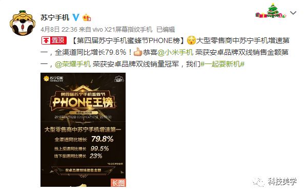 同天晚上,苏宁手机发布第四届苏宁手机蜜蜂节PHONE榜,凭借全渠道同比增长79.8%的成绩,稳据大型零售商中苏宁手机增速第一,再一次完成逆势增长。