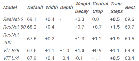 不过ViT-B/8和 ViT-L/4的最佳宽度分别是它们默认宽度的6% 和12% ,论文中还提供了对于其他超参数的更详细实验列表,如宽度、深度、训练步数、权重衰减、标签平滑和跨 ResNet 和 ViTs 的dropout。