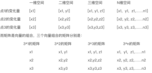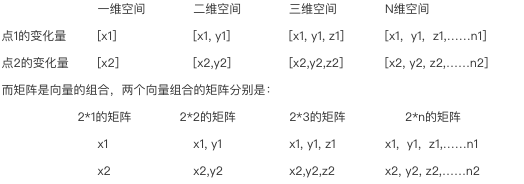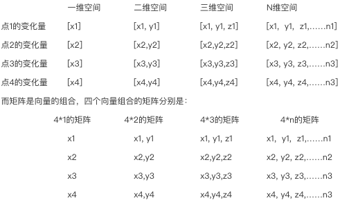 N维空间上的点的变化,好像点(x,y,z,.....n)在体上的移动,也即是2n个方向的线性变化,变化量可以表示为[x1, y1, z1,……n1]。