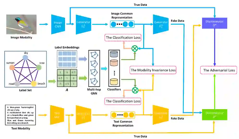 我们提出了一种新颖的对偶对抗图神经网络(Dual Adversarial Graph Neural Networks, DAGNN),该网络由对偶生成式对抗网络和多跳图神经网络组成,可以在跨模态检索任务中学习具有模态不变和判别能力的特征表示。首先,我们构造了对偶生成对抗网络,将多模态数据投影到一个统一的表示空间中。其次,我们利用多跳图神经网络,提出了一种层聚合机制来利用多跳传播信息,捕获标签相关性依存关系和学习相互依赖的分类器。在两个多标签跨模态检索基准数据集NUS-WIDE和MIRFlickr上证明了其有效性。