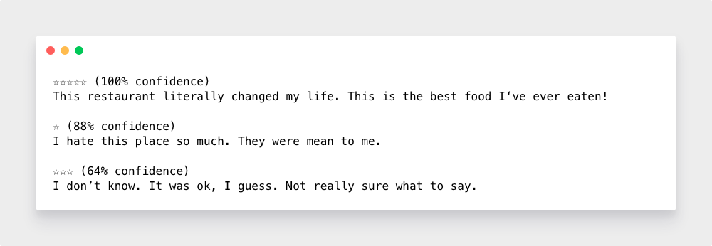 这些都是非常好的预测结果! 让我们看看它会给我的 Yelp 评论预测: