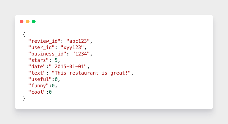 下载数据后,将获得一个名为reviews.json的4千兆字节json文件。 文件中的每一行都是一个json对象,其数据如下: