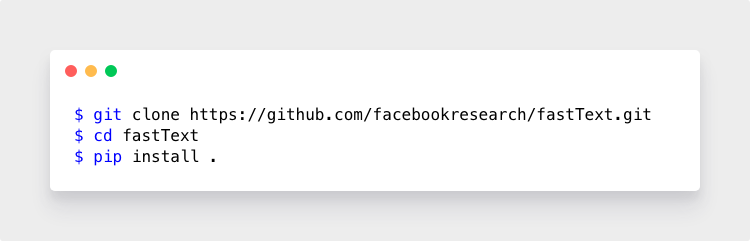 您可以使用一些不同的用于 fastText 的 Python 包装器,但我喜欢Facebook创建的官方包装器。 您可以按照以下说明进行安装 。