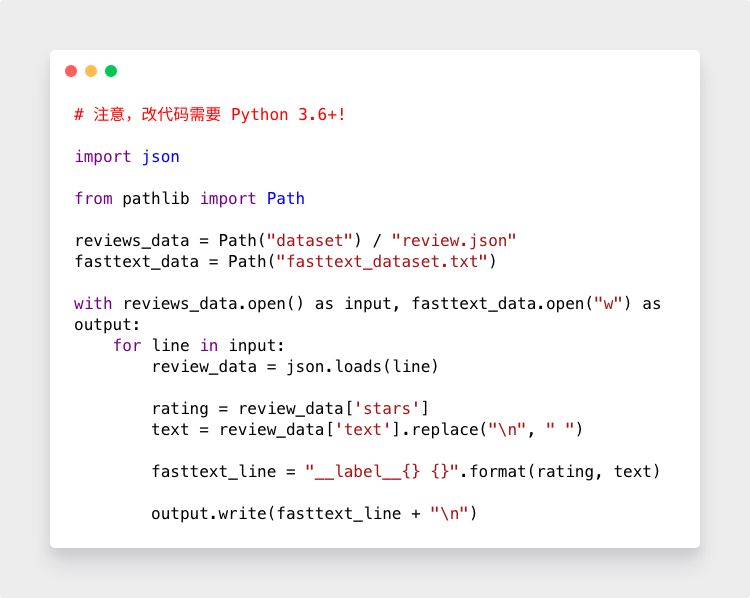 这是一段简单的 Python 代码,它将读取 reviews.json 文件并以fastText格式写出一个文本文件: