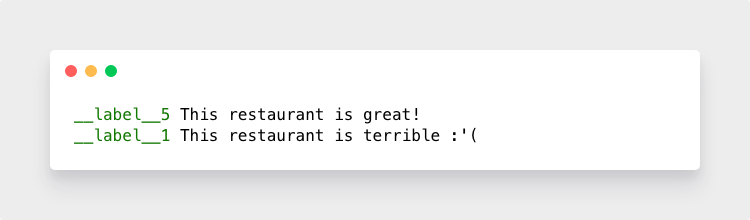 fastText需要一个文本文件,每行文本都在一行上。每行的开头都需要有一个__label__YOURLABEL的特殊前缀,用于为该段文本分配标签。