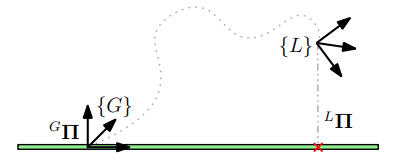 图1 上图中G帧的最近点平面表达是具有奇异性的,因为其投影中心就在平面上;L帧的定义是合理的,在该帧下用红×点表示该平面。