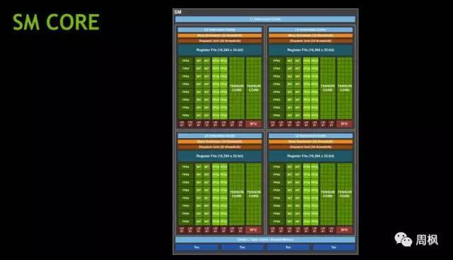 我们确实想要快速展示一下SM核心。人们会注意到SM核心有一个大的张量核(Tensor Core)。在这里NVIDIA这代的关注点就很明确了。
