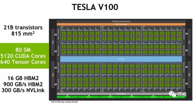 可以看到,NVIDIA Tesla V100有80个流处理器(SM)。这张幻灯片上的小脚注,我们可以从座位上清楚地看到。该公司表示,完整的GP100芯片包含84个流处理器,因此NVIDIA是采用了Binning,以提高产量。