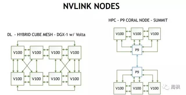 GV100将有多达6个NVLINK连接,它允许一些拓扑结构,以方便GPU与GPU连接。这当然是一种比我们在PCIe交换机中看到的得到更多GPU间带宽的方法。单根v双根深度学习的GPU到GPU系统。