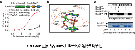 值得注意的是,在上述控制过程中,细菌双组分信号转导系统RavS-RavR之间的特异性关系不但决定于这两个蛋白的一级序列,而且需要c-di-GMP信号分子的驱动。因此,研究新发现了一种控制细菌双组分信号转导系统特异性的生物化学机制,并为发展新型抗菌化合物提供了关键分子作用靶标。