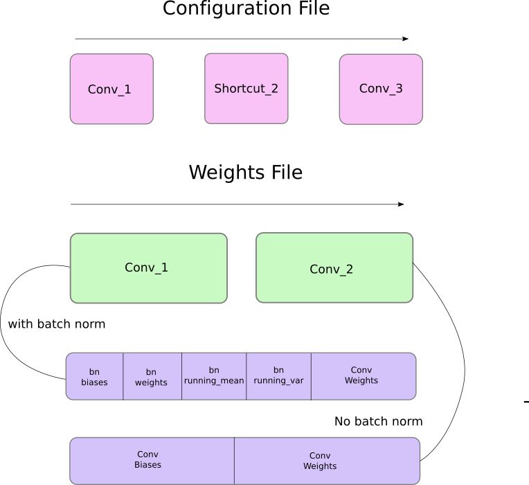 首先,权重只属于两种类型的层,即批归一化层(batch norm layer)和卷积层。这些层的权重储存顺序和配置文件中定义层级的顺序完全相同。所以,如果一个 convolutional 后面跟随着 shortcut 块,而 shortcut 连接了另一个 convolutional 块,则你会期望文件包含了先前 convolutional 块的权重,其后则是后者的权重。