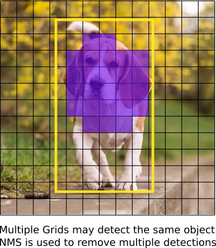 非极大值抑制:非极大值抑制(NMS)可解决对同一个图像的多次检测的问题。例如,红色网格单元的 3 个边界框可以检测一个框,或者临近网格可检测相同对象。