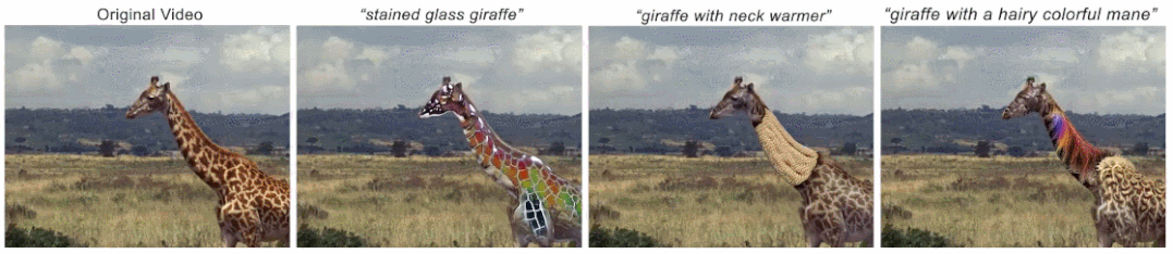 或是对着视频说「给长颈鹿戴个围脖」,它也能精确识别出来长颈鹿的脖子,并在每一帧都给它戴上一个围脖,还能换各种不同的效果。
