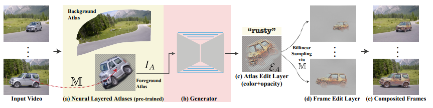 视频的训练Pipeline包括(a)一个预训练的固定分层神经图集模型,可以用作「视频渲染器」,包括了一组二维图集、从像素到图集的映射函数,以及每个像素的前景/背景透明值;(b)框架训练一个生成器,将选定的离散图集IA作为输入,并输出;(c)一个图集编辑层EA;(d)使用预训练映射网络M把编辑过的图集渲染回每一帧;(e)在原始视频上进行合成。
