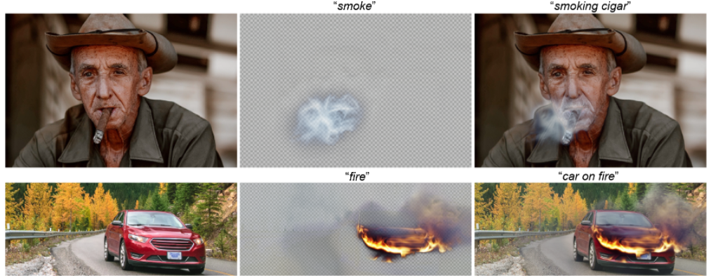 比如前面的例子中使用文本提示「烟」,不仅输出最终的编辑图像,还表达了编辑层所代表的目标效果。