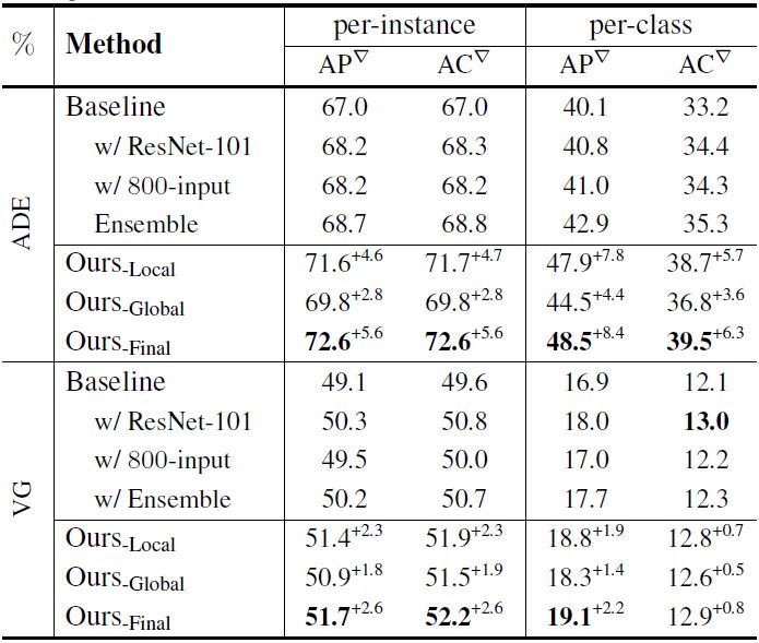 表 1. 在 ADE test-1k 和 VG 测试中的主要结果。AP 是平均精度,AC 是分类精度。上标显示了高于基线的值。