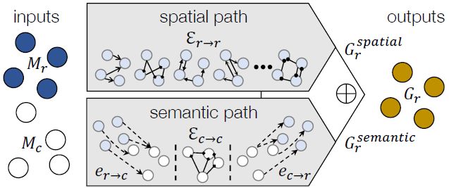 图 4. 在全局推理模块 R 中使用了两种推理路径。获得区域和类输入 M_r 和 M_c 之后,空间路径在区域图中直接传递信息,区域图含有区域到区域的边 E_r→r,而语义路径首先将区域分配给含有 E_r→c 的类,然后将信息传递给具有类到类边 E_c→c 的其他类,再传播回去。组合最终输出以生成输出区域特征 G_r。