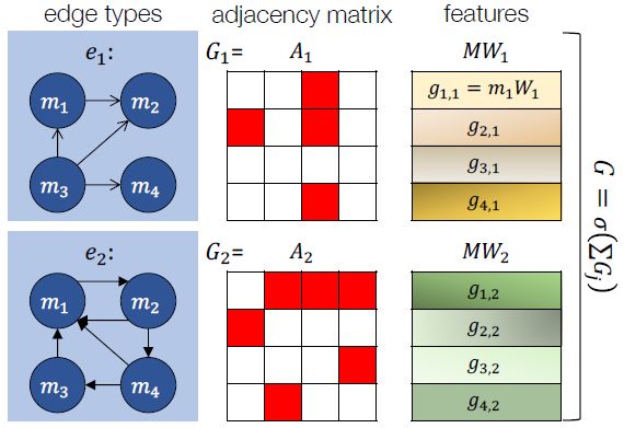 图 3. 在具有多种类型的边的图形上直接传递信息的图示。图中的四个节点由两种类型的边进行连接。每个节点表示输入特征向量 mi (合称 M )。为边类型 j 学习加权矩阵 Wj 以变换输入。然后应用邻接矩阵 Aj 将信息传递给连接的节点。最后,通过累加所有边类型并应用激活函数来生成输出 G。