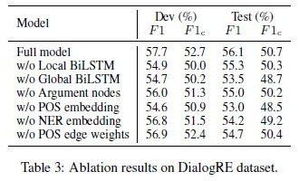 为了理解模型组件的影响,论文使用模型在 DialogRE 数据集上执行 ablation study,结果见表 3。