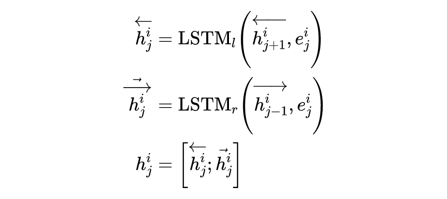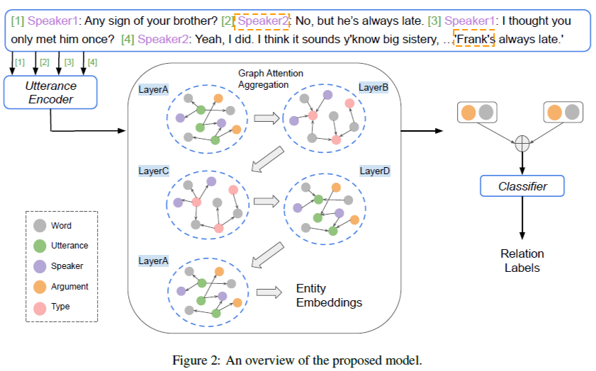 1. 首先利用一个由两个双向长短期记忆网络组成的语音编码器对会话信息进行编码。这些话语编码,连同单词嵌入、说话者嵌入、论点嵌入和类型嵌入,在逻辑上连接起来,形成一个异构。