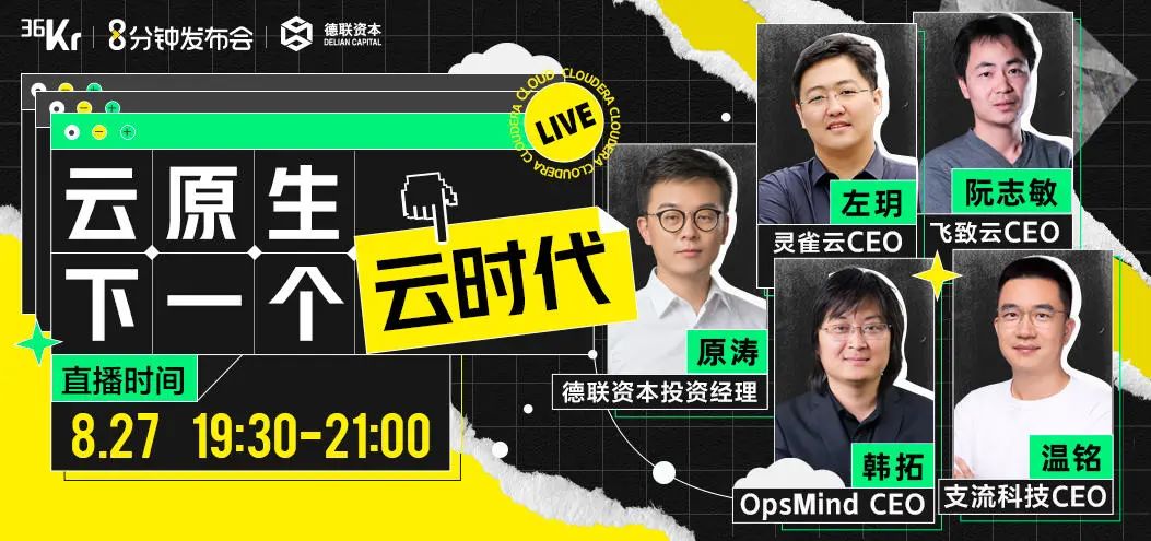 8月27日晚7点30分,德联资本投资经理原涛、企业级云原生全栈解决方案商[灵雀云] CEO 左玥、多云时代技术领先的企业级软件提供商[飞致云] CEO 阮志敏、低代码运维开发平台[OpsMind] CEO 韩拓、开源云原生API网关[支流科技] CEO 温铭,将来到36氪8分钟发布会聊一聊他们对于云原生行业发展现状和未来趋势的看法。